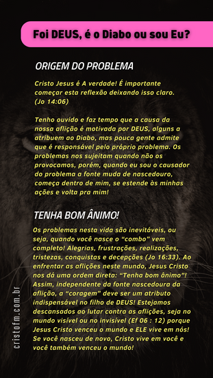 Cristo Jesus é a verdade! É importante começar esta reflexão deixando isso claro (Jo 14:06). Tenho ouvido e faz tempo que a explicação para a nossa aflição é causada por DEUS, alguns a atribuem ao Diabo, mas pouca gente consegue admitir que é responsável pelo próprio problema. Os problemas nos sujeitam quando não os provocamos, porém, quando eu sou o causador do problema a fonte muda de nascedouro, neste caso começa dentro de mim e se estende às minhas ações!