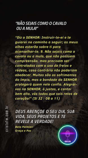 “Diz o SENHOR: Instruir-te-ei e te guiarei no caminho a seguir; os meus olhos estarão sobre ti para aconselhar-te. 9. Não sejais como o cavalo ou a mula, que não possuem compreensão, mas precisam ser controlados com o uso de freios e rédeas, caso contrário não poderiam obedecer. Muitos são os sofrimentos do ímpio, mas a bondade do SENHOR protegerá quem nele confia. Alegrai-vos no SENHOR, ó justos, e cantai bem alto, vós todos que sois retos de coração!” (Sl 32 : 08 a 11)